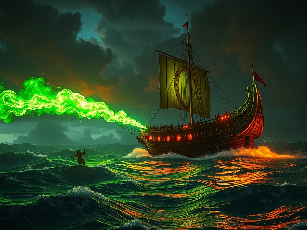 Sailors leapt into the sea to escape, only to find the water itself alive with fire—sticking to skin, roaring in the waves like a god betrayed.